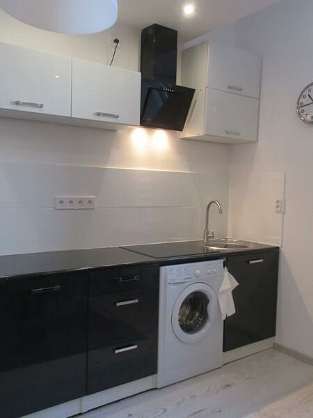 Aneks kuchenny: szafki, lodówka, pralka, okap.
