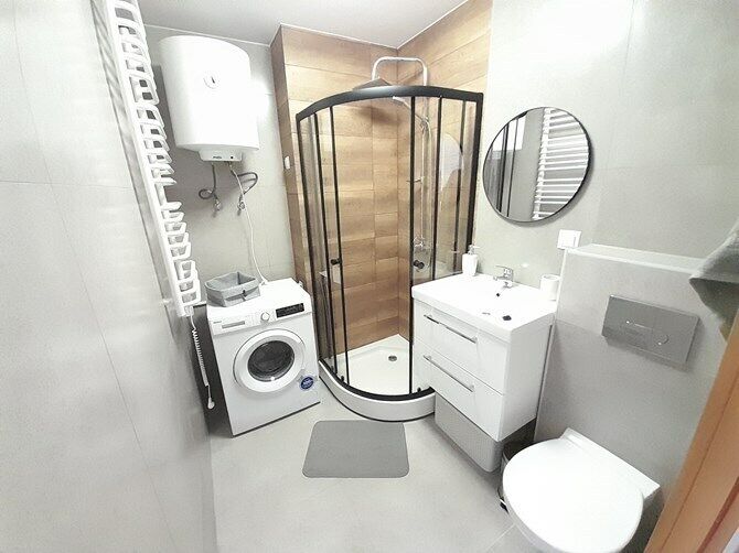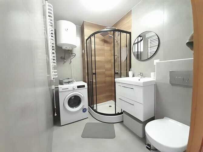 Łazienka z WC: pralka, kabina prysznicowa, umywalka, szafka, lustro