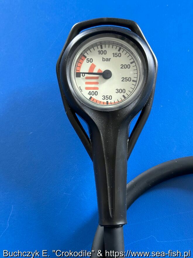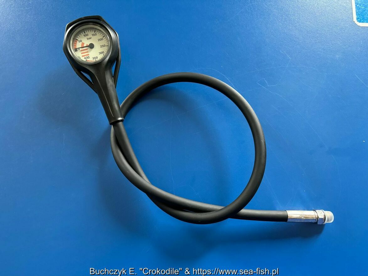 Mały, poręczny manometr z obudową i wężem HP 80cm.