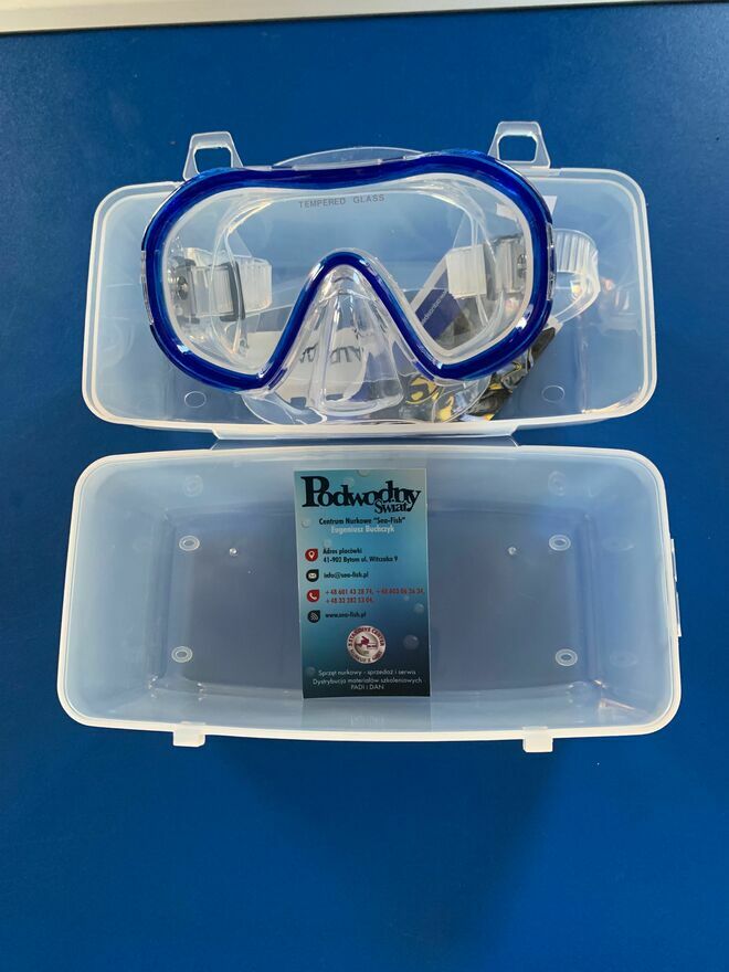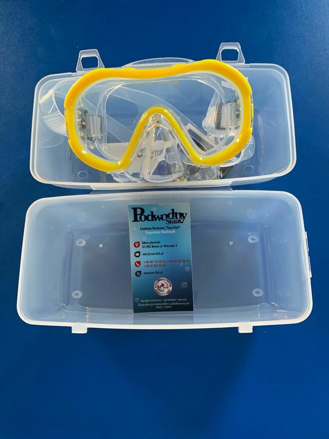 Dziecięca maska nurkowa o klasycznym kształcie z pojedynczą szybką wykonaną z hartowanego szkła. Kompaktowa budowa sprawia, że idealnie dopasowuje się do dziecięcych twarzy.Kolor żółty lub niebieski