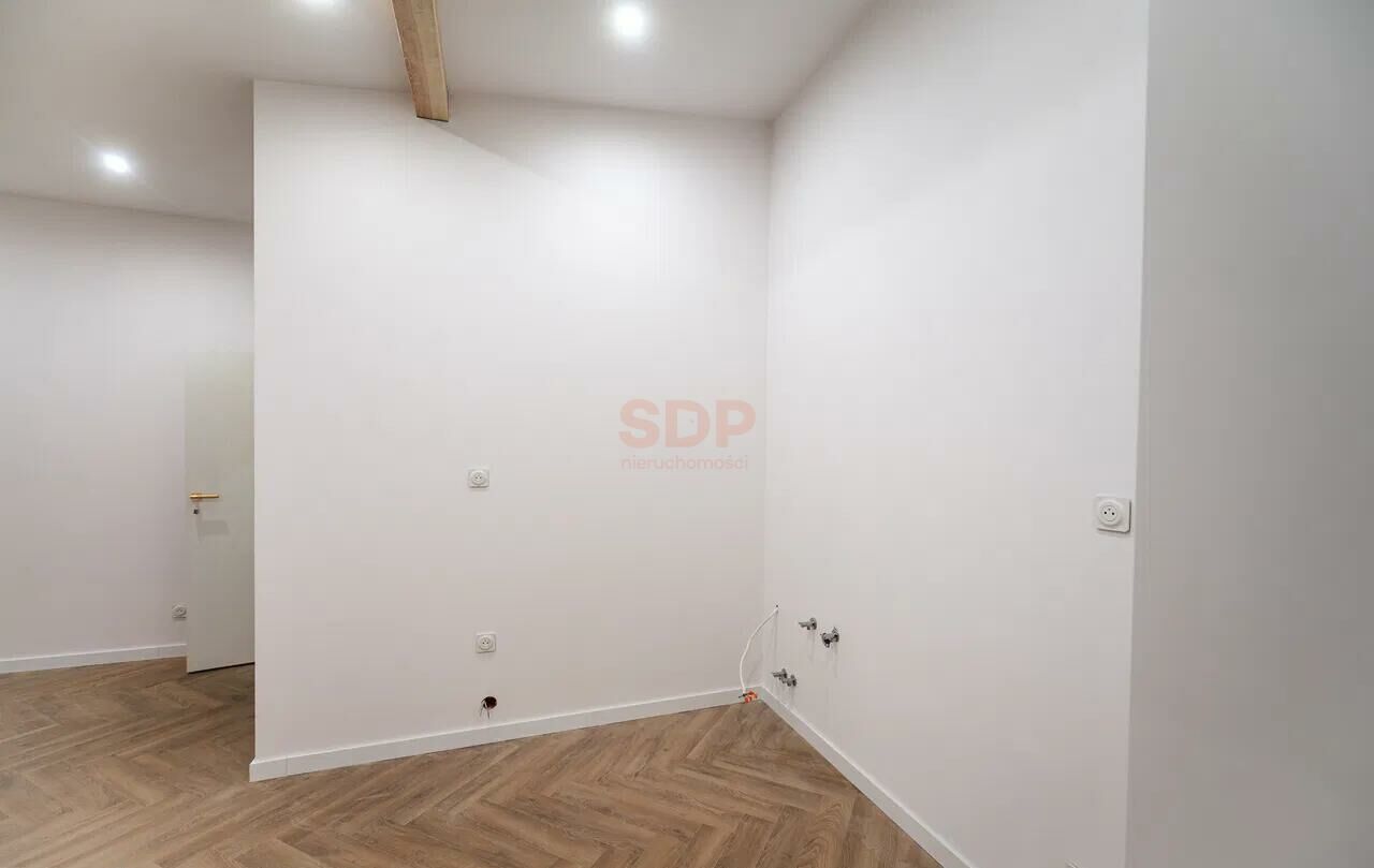 Nieruchomość składa się z przestronnego salonu, oddzielnej sypialni, funkcjonalnej kuchni, łazienki z toaletą oraz przedpokoju. Wnętrza wyróżniają się wysokimi sufitami, dużymi oknami zapewniającymi świetne doświetlenie oraz oryginalnymi, odrestaurowanymi belkami sufitowymi, które nadają mieszkaniu wyjątkowego charakteru loftowego.