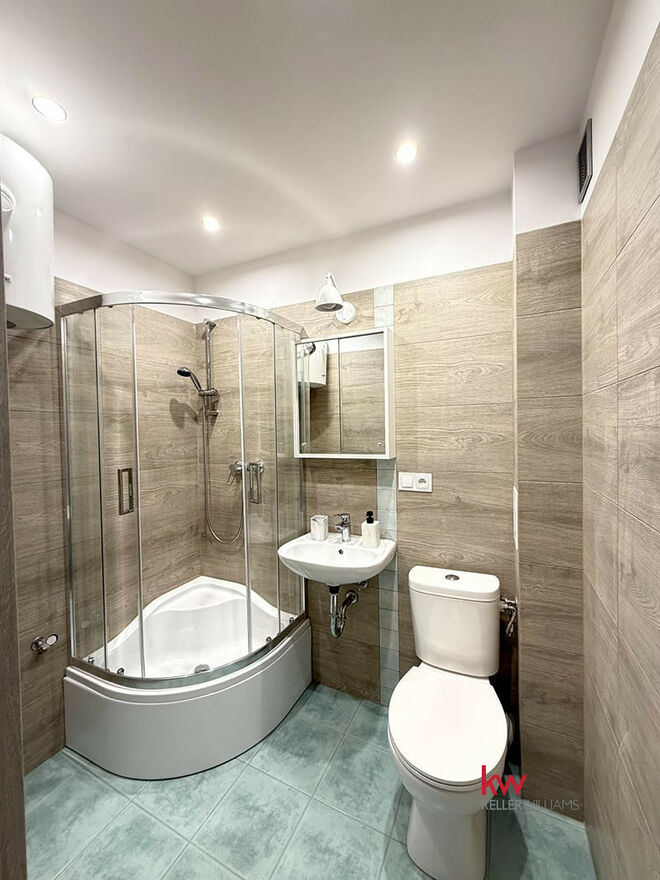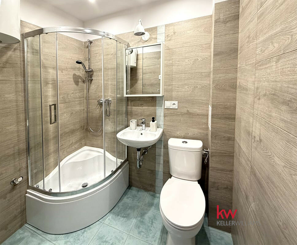 - łazienka wyposażona w kabinę prysznicową.