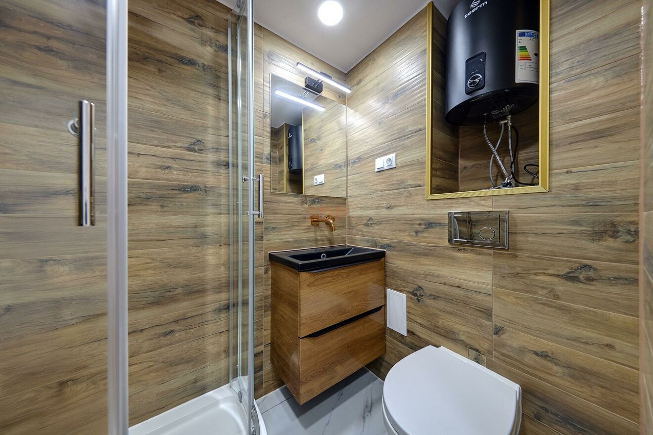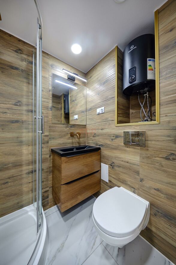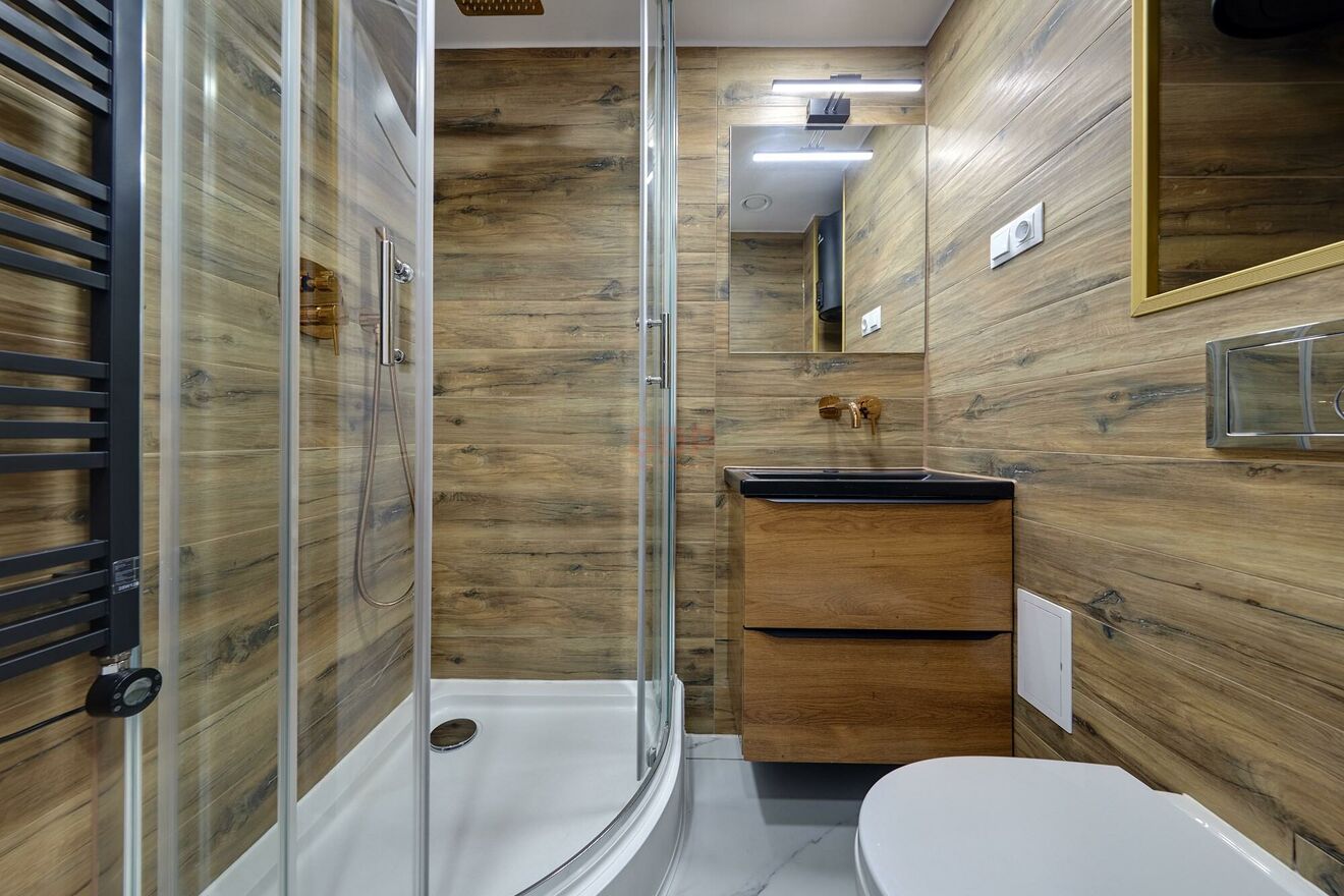 -Wykończenie premium panele w odcieniu naturalnego drewna w całym mieszkaniu, LED-y, armatura w kolorze czarnym, eleganckie połączenie płytek imitujących drewno z marmurową posadzką w łazience.