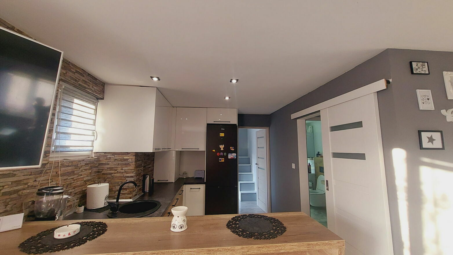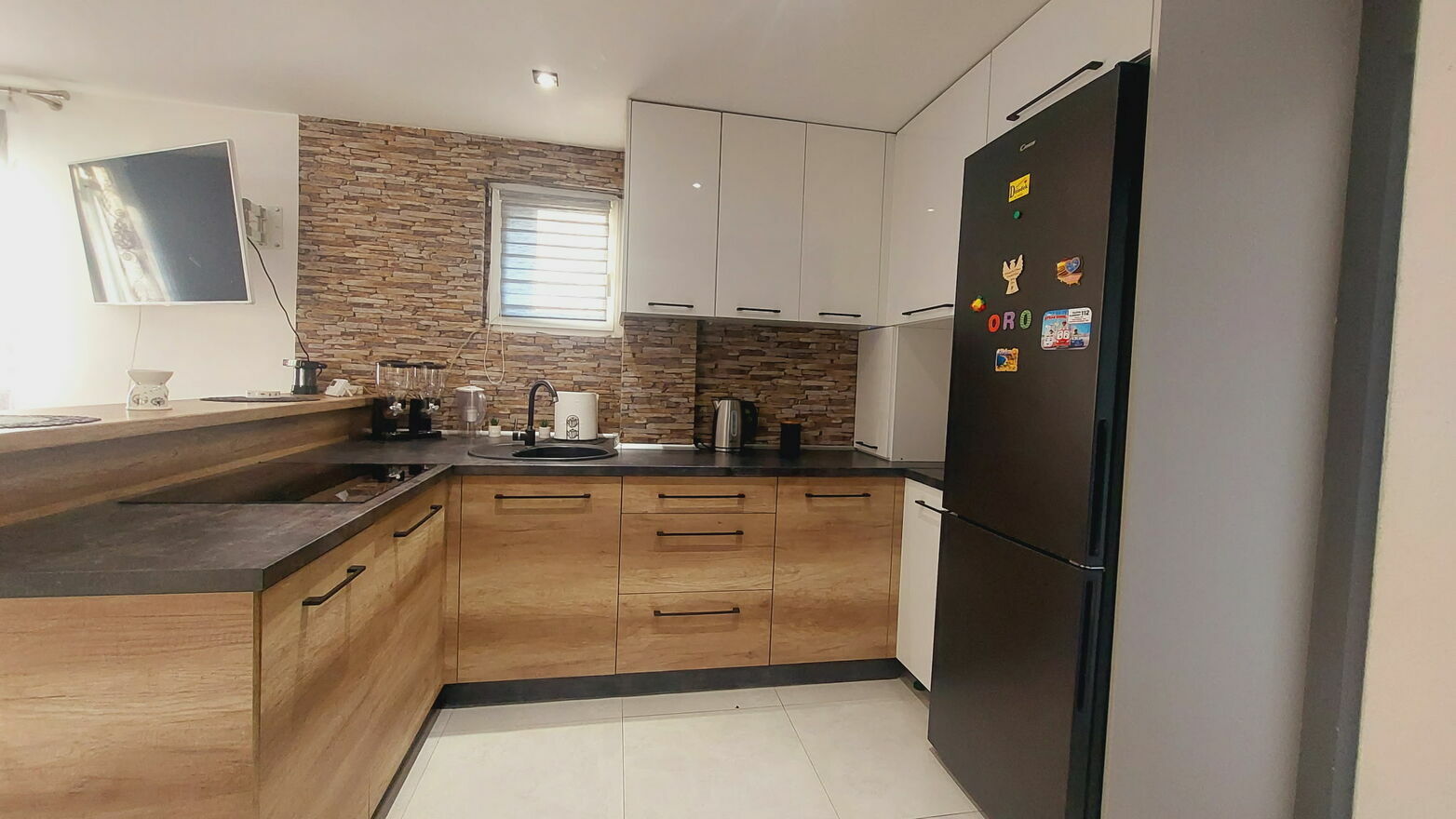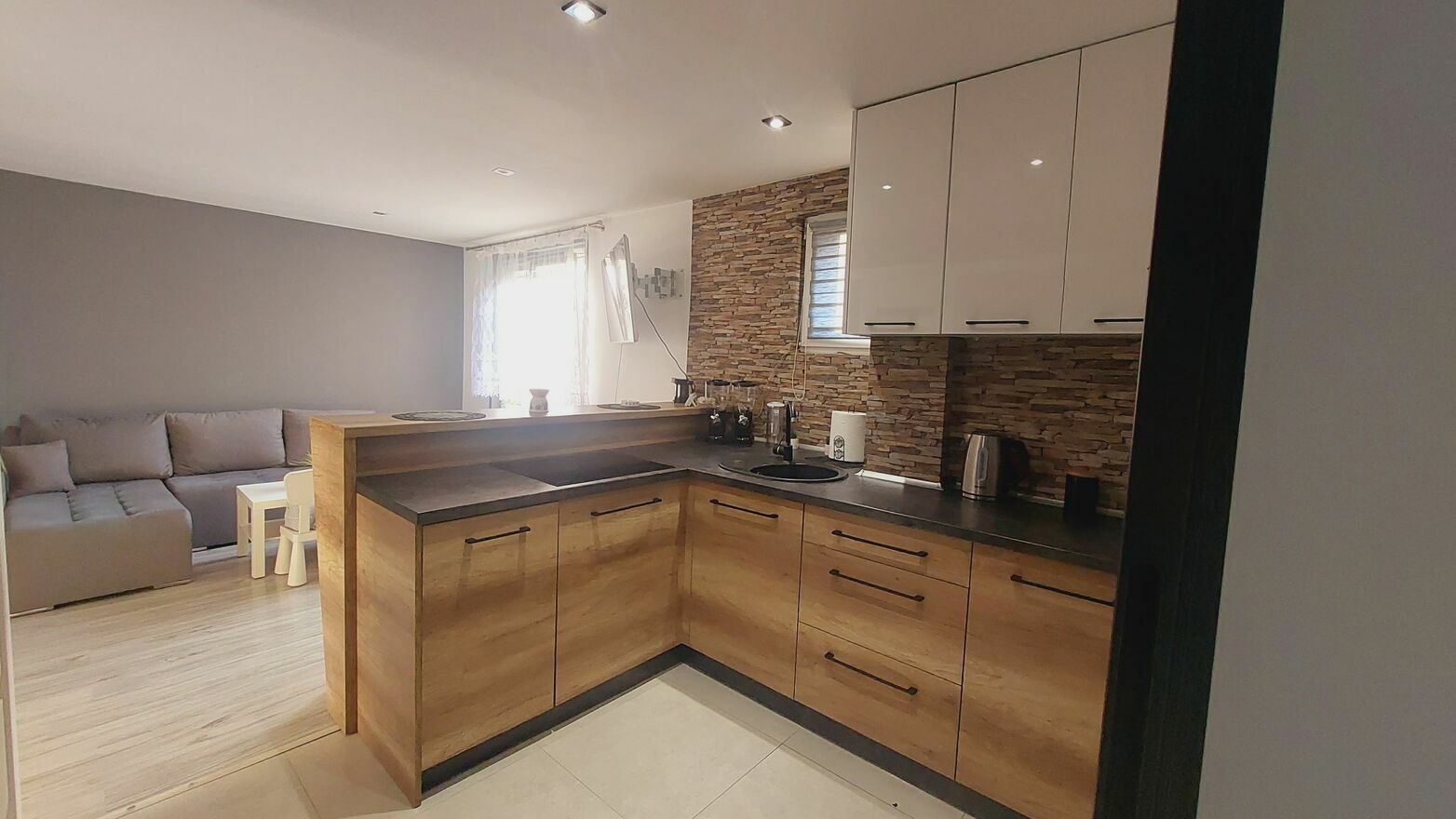 - Kuchnia z zabudową na wymiar w pełni wyposażona z wykorzystaniem nowoczesnych, zabudowanych sprzętów AGD: