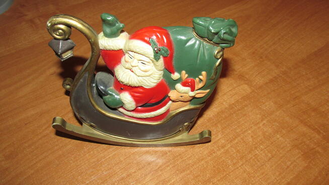 Stara ponad 30 - letnia sprawna pozytywka: Mikołaj na saniach; produkt chiński.