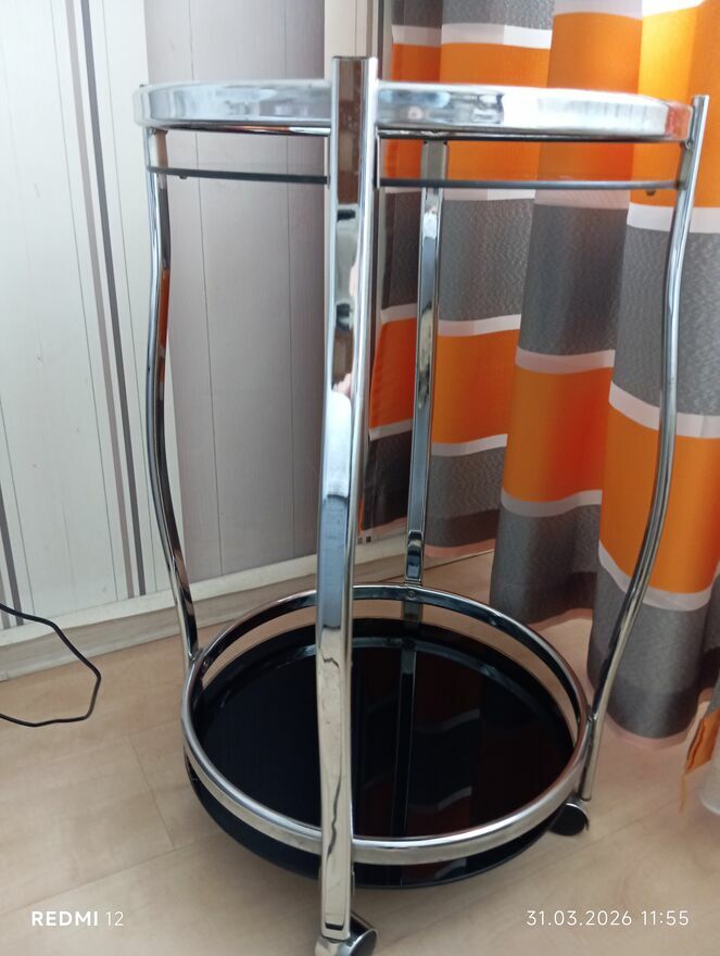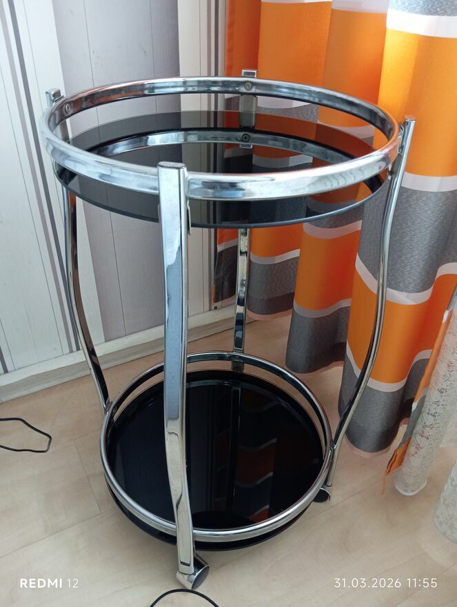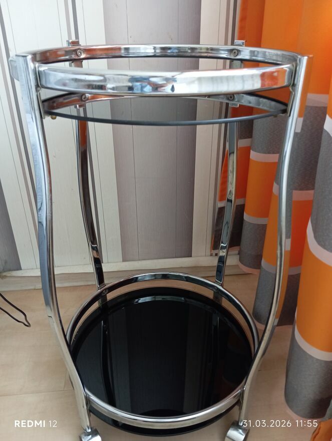 Praktyczny stolik na kółkach, który można wykorzystać jako mobilny barek lub pomocnik w kuchni. Solidna konstrukcja ze stali chromowanej zapewnia stabilność i trwałość. Idealny do przechowywania i serwowania napojów lub przekąsek.Średnica 40cm