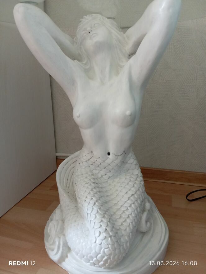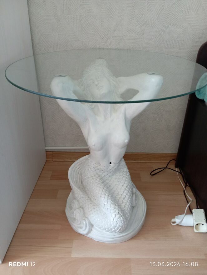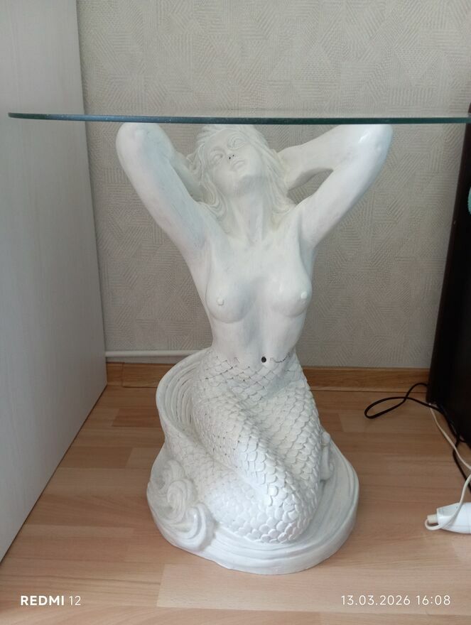 Stolik szklany na pięknej podstawie przedstawiającej syrenę. Syrena została pomalowana na biało. Stolik jest bardzo ciężki.Wysokość 55cm