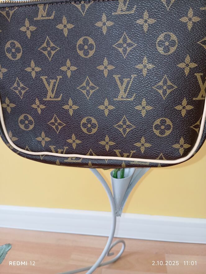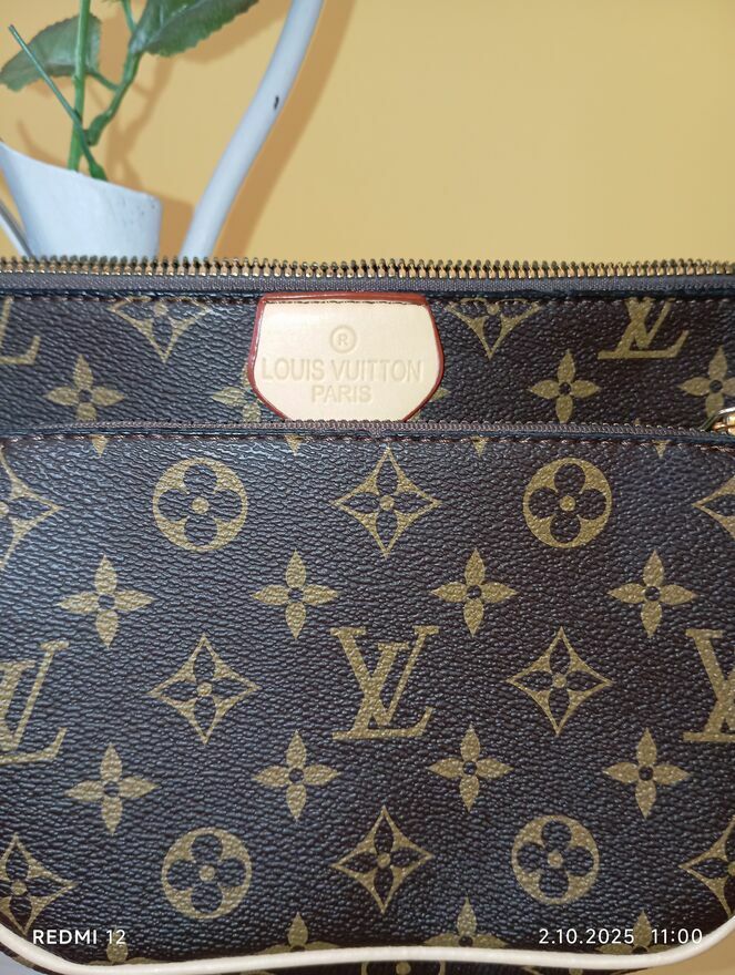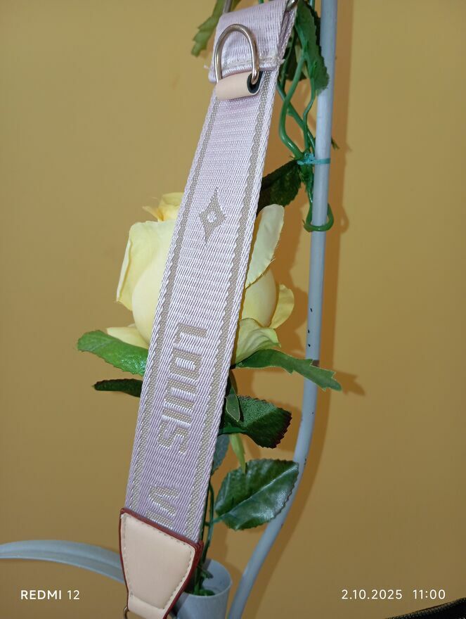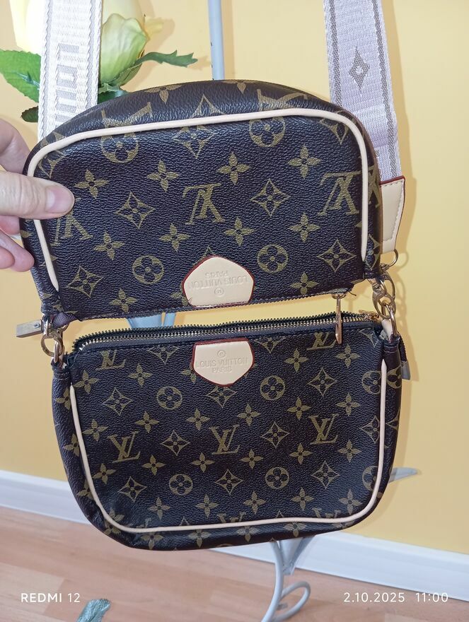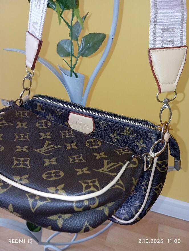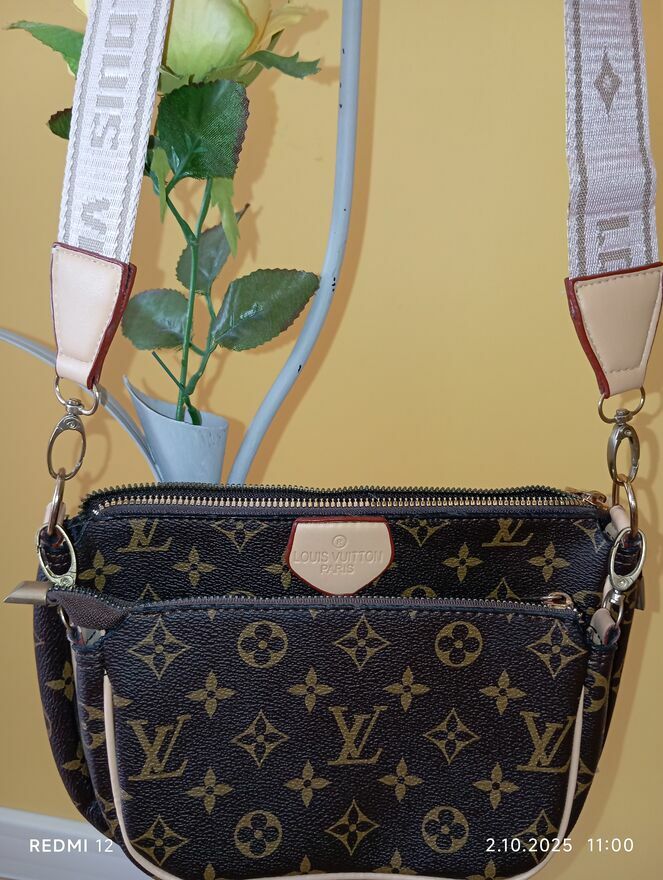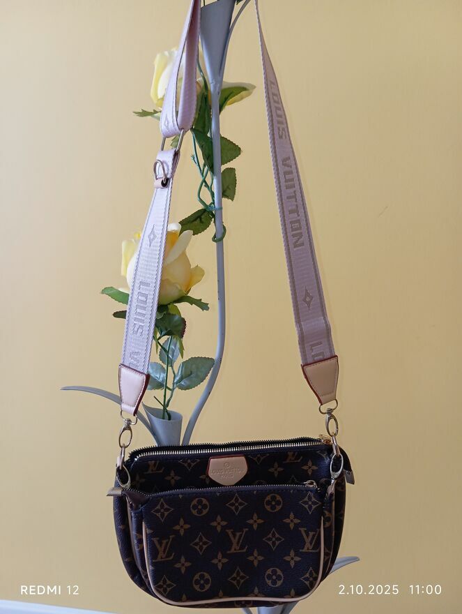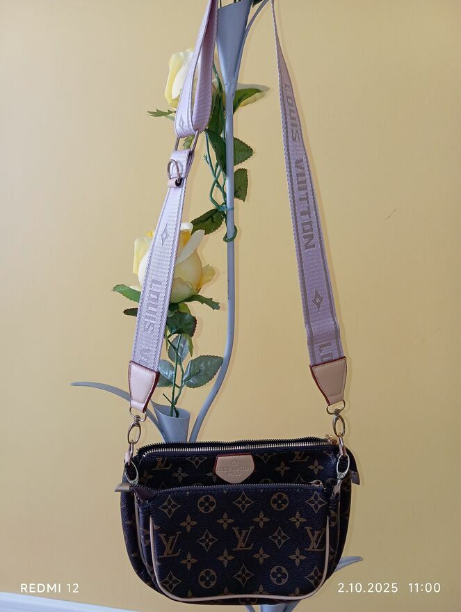 Torebka na szerokim pasku, pasek do regulacji. Torebka składa się z dwóch torebek.Wymiary większej części:
