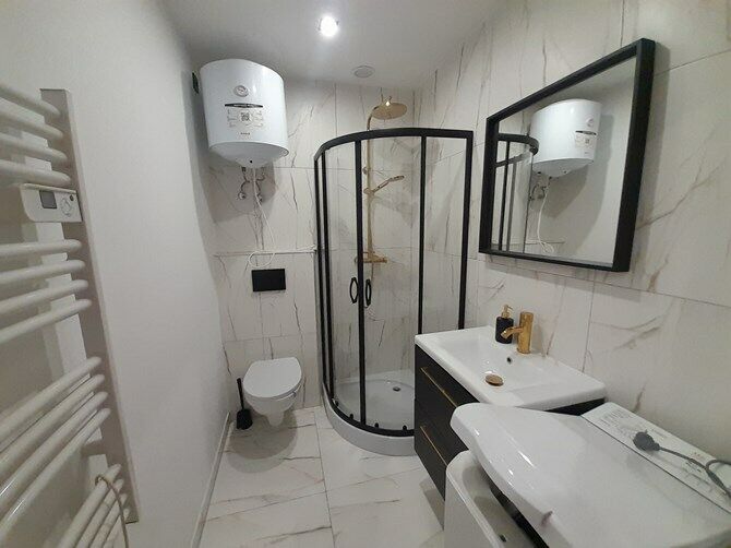 Łazienka z WC: wanna, umywalka, szafka, lustro, pralka