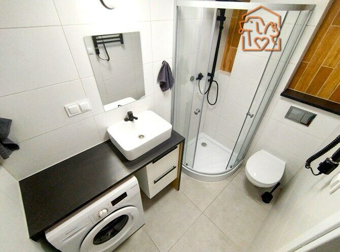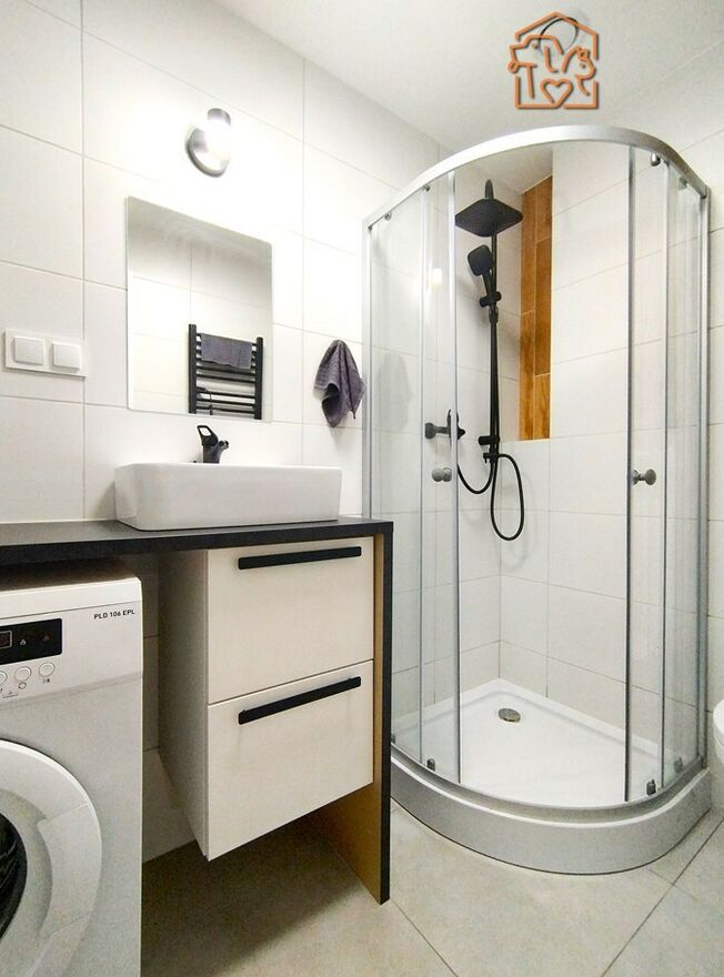 Łazienka razem z WC: kabina prysznicowa, lustro, pralka